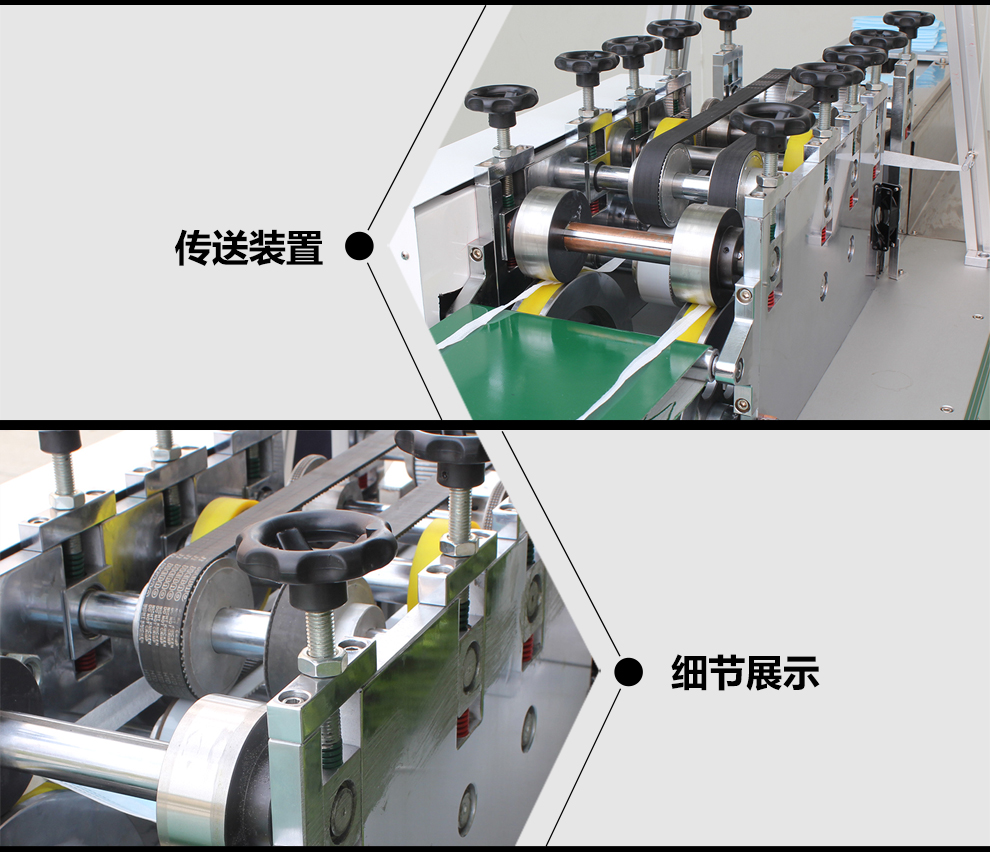 采用超聲波焊接方式將無紡布綁帶焊接于口罩本體兩側(cè),需要人工將口罩本體置于機器的傳輸帶上,后續(xù)拉筒包邊,花輪壓合,綁帶切斷和輸出成品工作均為全自動完成。